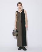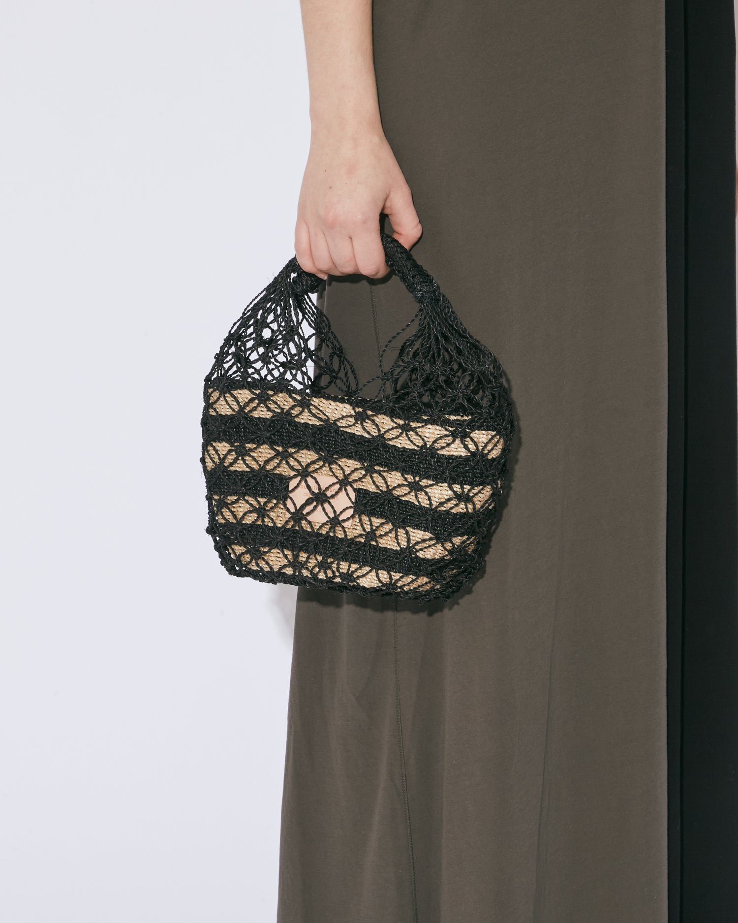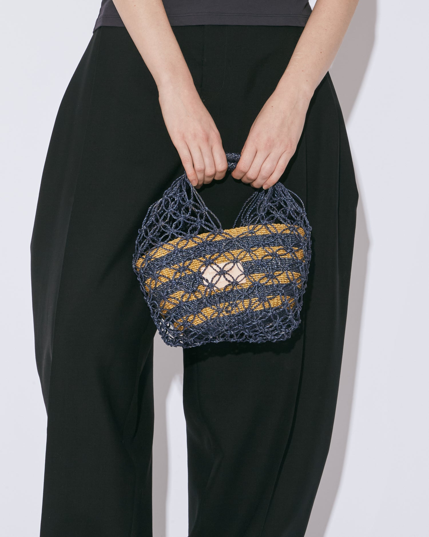 ボーダー柄に編まれた横長のバスケットをメッシュ状に編まれたトートバッグに包み込んだような二重構造