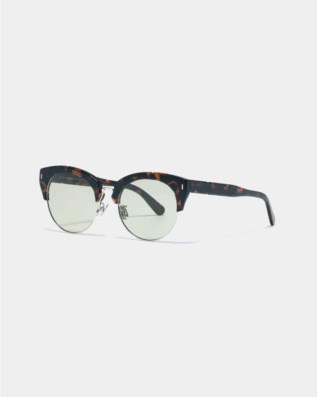 ・テンプルにはべっ甲調の斑柄の合間から金属芯へのコラボレーションロゴの彫金が見られる※blackフレームは透けては見えません